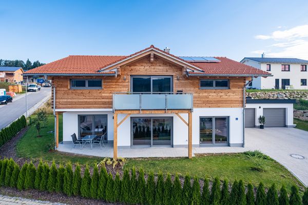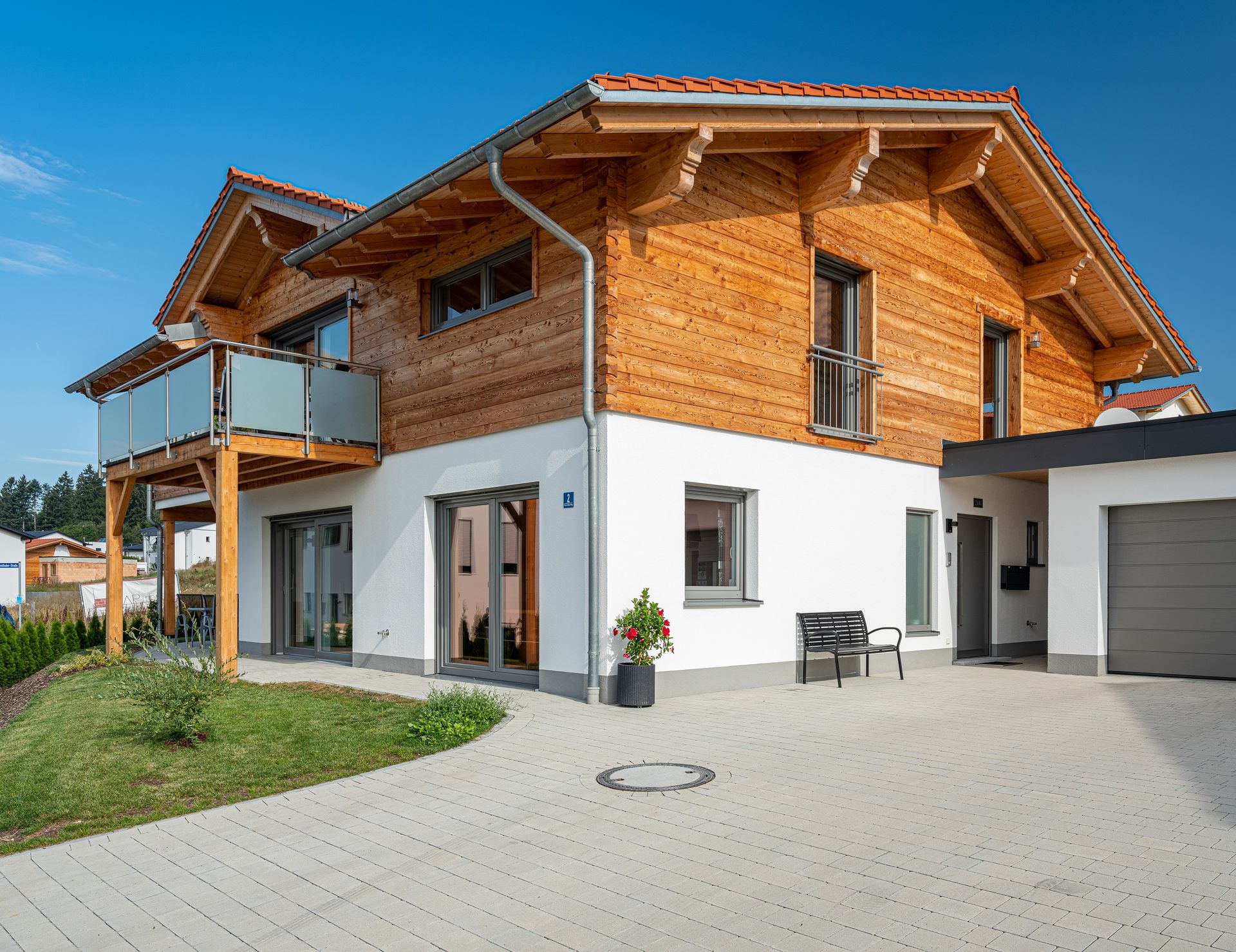 Das Mehrgenerationenhaus bietet mit einer Gesamtwohnfläche von 217 m² genügend Platz für Jung und Alt. Eine Kombination aus Putz- und Lärchenholzfassade verleiht diesem Haus den besonderen Charakter. Durch die natürliche Vergrauung des Holzes passt sich der Farbton an das dezente Grau der Fenster an. Der aufwendige Sichtdachstuhl im Innenbereich gewährt der Dachgeschoßwohnung ein besonderes Augenmerk.
